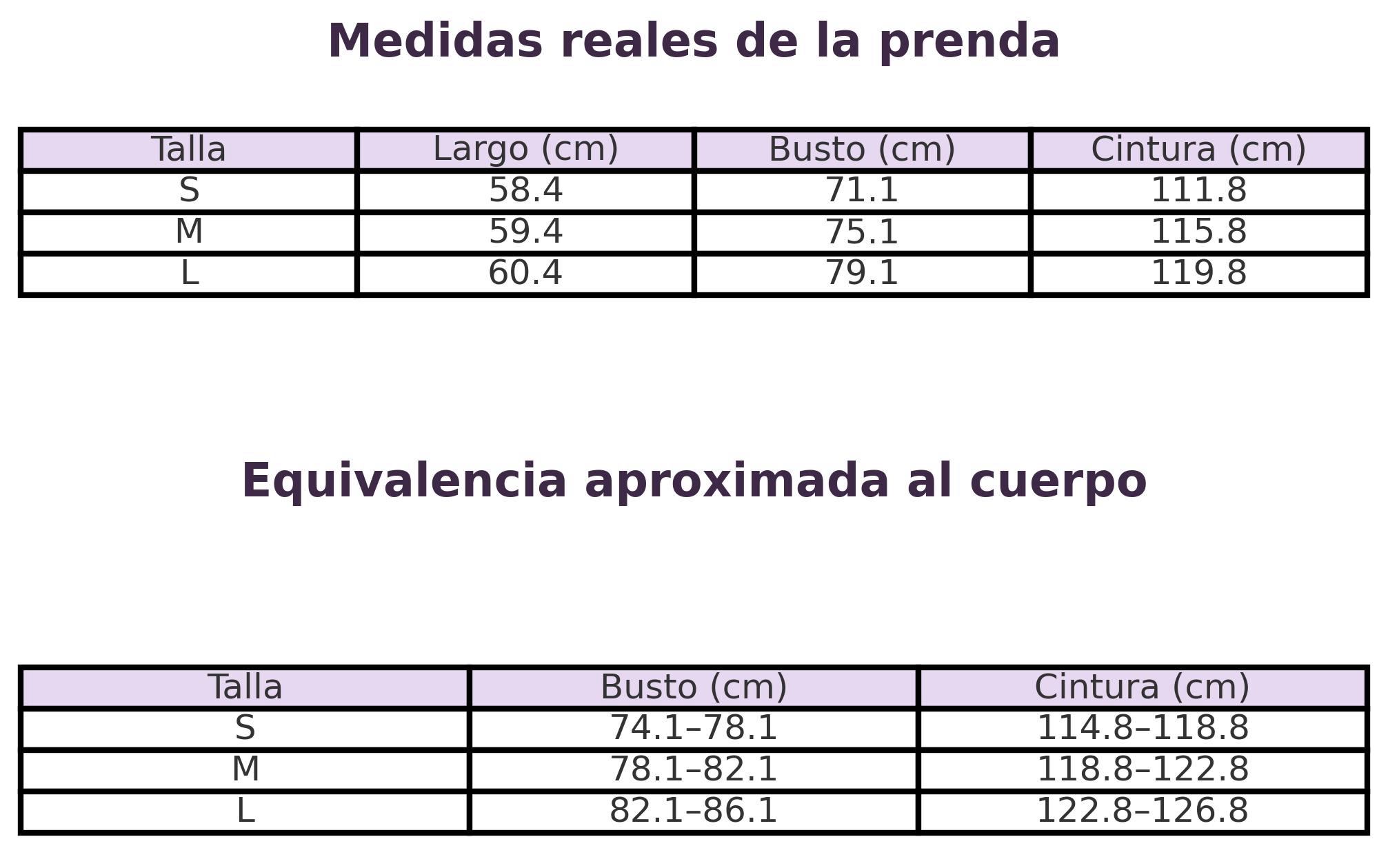 Medidas de la modelo: Talla S — Largo: 58 cm | Busto: 71 cm | Cintura: 66 cm