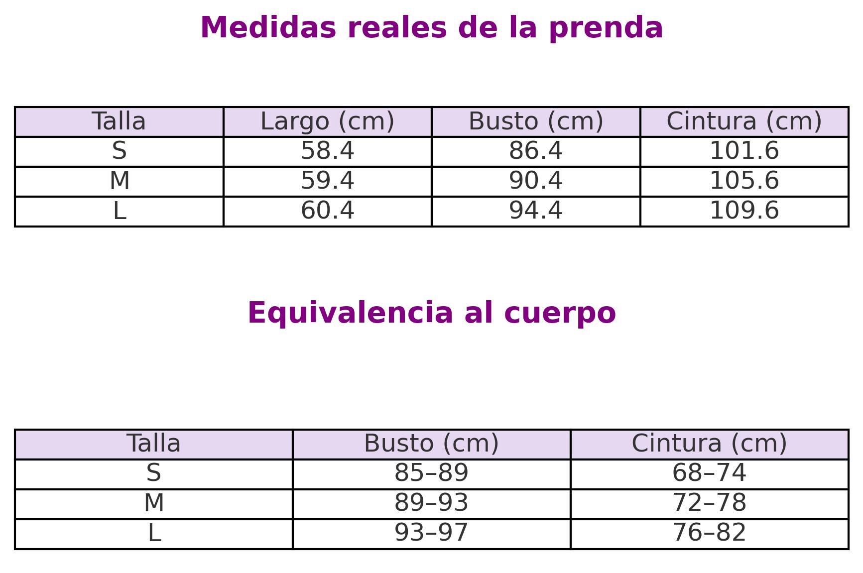 Medidas de la modelo: Talla S — Largo: 58 cm | Busto: 91 cm | Cintura: 51 cm