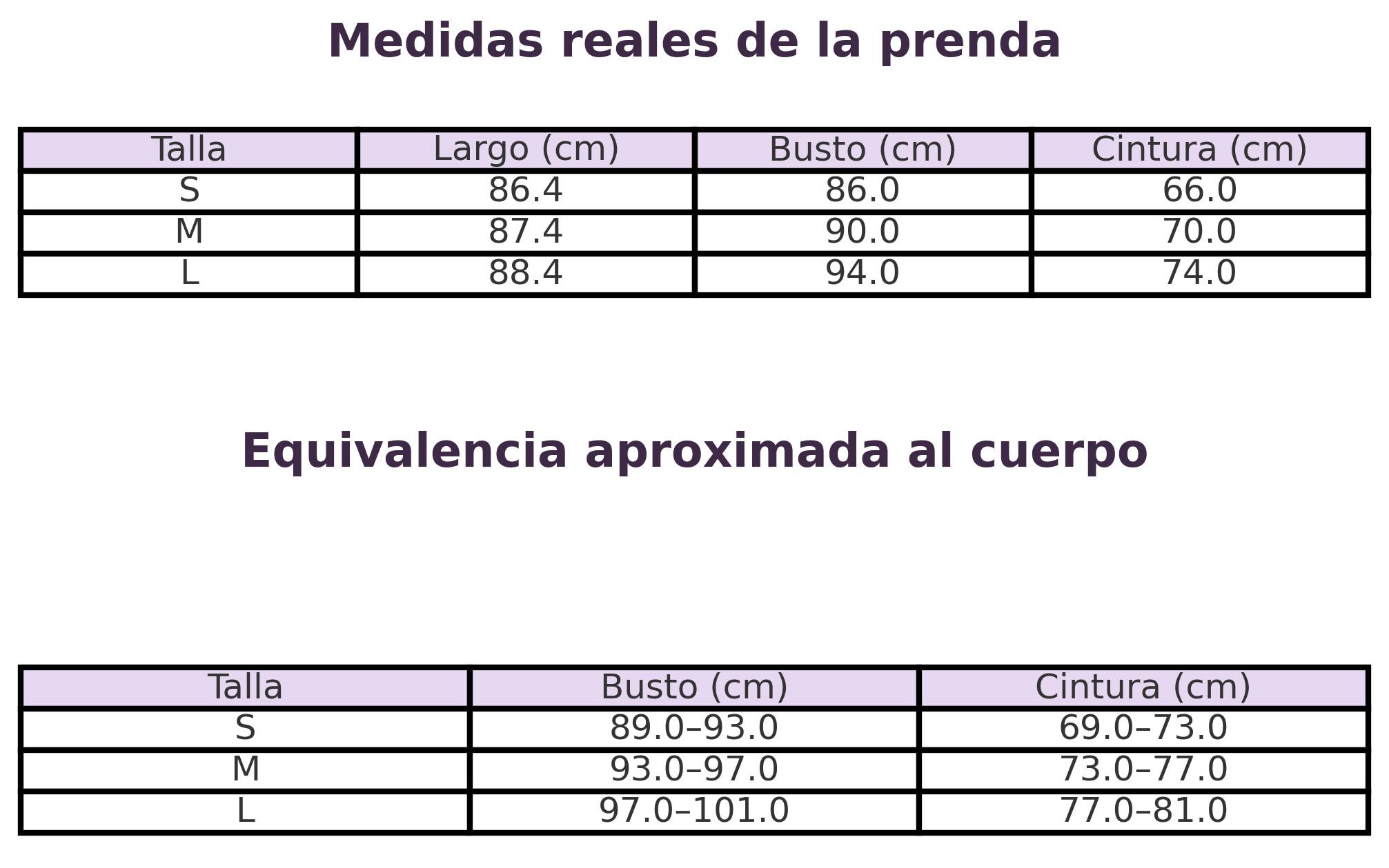 Medidas de la modelo: Talla Small — Largo: 86 cm | Busto: 86 cm | Cintura: 66 cm